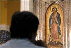 Roger Archila, un capitalino de 45 años, ha dedicado algo de tiempo antes de que inicie la eucaristía de las 6:00 de la tarde. Elevando la vista y las manos al cielo, se ha paralizado en un trance con la madre de América, la Virgen de Guadalupe.