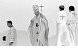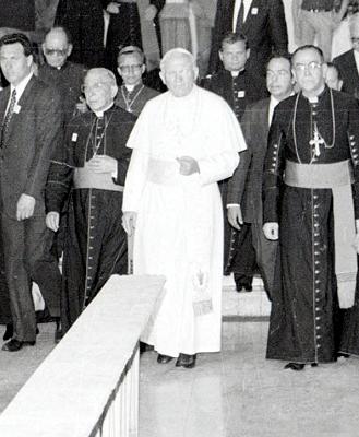 El Papa flanqueado por monseñor Luis Chávez y González y Monseñor Arturo Rivera y Damas, después de pedir visitar personalmente la tumba de Monseñor Romero
