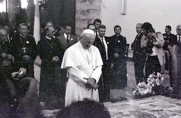 Su Santidad orando ante la tumba de Monseñor Óscar Arnulfo Romero, asesinado apenas dos años antes en esa época.