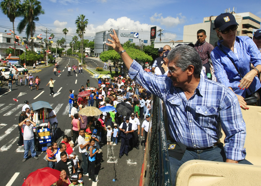 Norman Quijano, alcalde de San Salvador se traslado a bordo de la “conga bus”, desde donde saludan a los capitalinos. FOTO LPG/ GIOVANNI LEMUS
